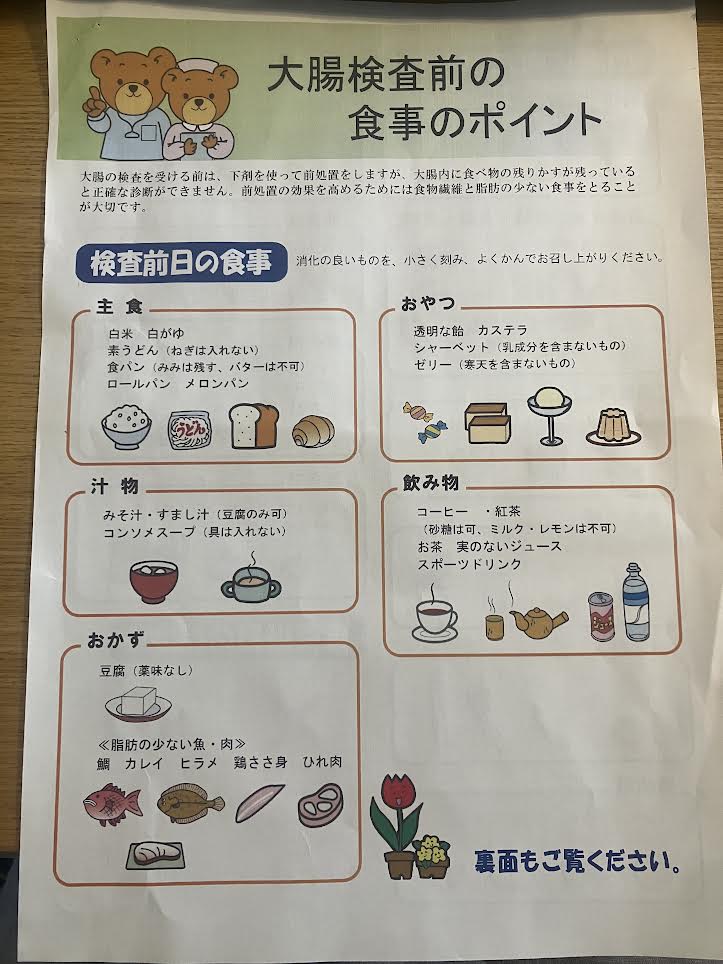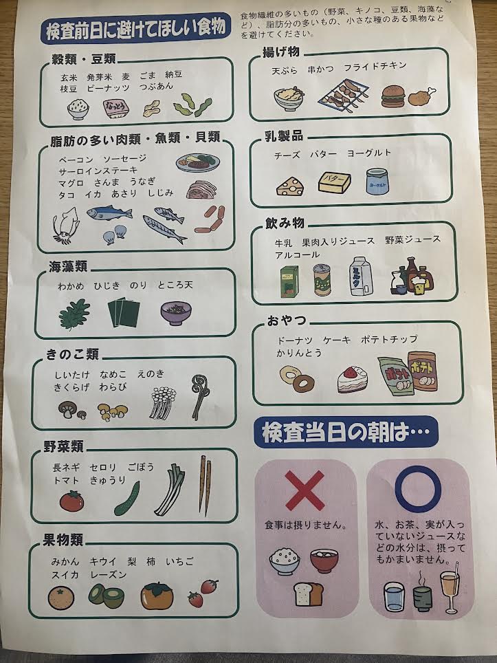 はじめてこの検査を受けたのは3年前。ちょうど夫が糖質制限ダイエット中で、「できれば何日か前から消化の良いものを。前日食べるものは米、パン(焼かない、耳は食べないなどの細かい制限付き)、うどん(ネギ入れない)」 などなどきびしい指示書もらったのに、「要するに全部出せばいいんでしょ!」と、完全に舐めてかかってました。前日も鶏むね肉とブロッコリーをワシワシかみ砕いていたような💦