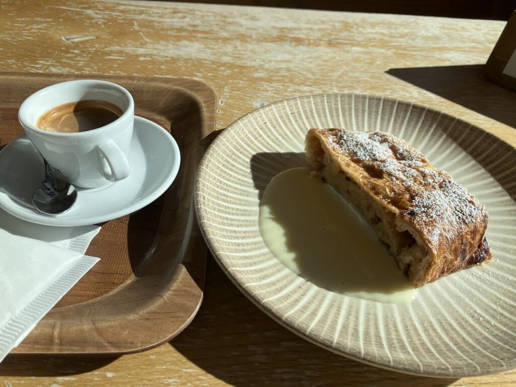 始発で上がった私たちのあとに、どんどん観光客が上がってきてはトレッキングに散っていきます。昨日歩きすぎたので今日はスローダウン。カフェで休んで今日も「一番ローカルなケーキを頂戴♡」とオーダー。リンゴの他に何がかいっているの?「ぴね」後でわかりました「PINE=松」でした。温かいカスタードソースがとろり。思い出したらまた食べたい~