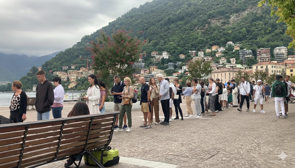…ここで船の乗り場に長蛇の列を発見!私たちが昨日、ベッラージョから乗ってきた観光船。実は観光客に大人気で、コモからベッラージョに行く人たちで早朝からこのような行列ができます。高速船や、独自の遊覧船(クルーズ)のカウンターも出ていて、そちらはいいお値段💦 逆方向から11.4ユーロで乗れたのはとてもラッキーだったことに気づいてにんまり。